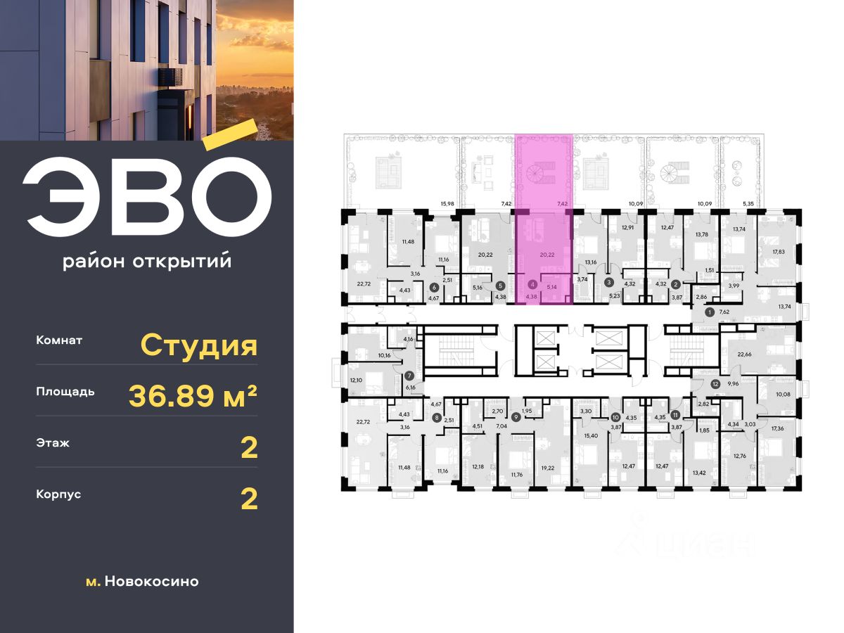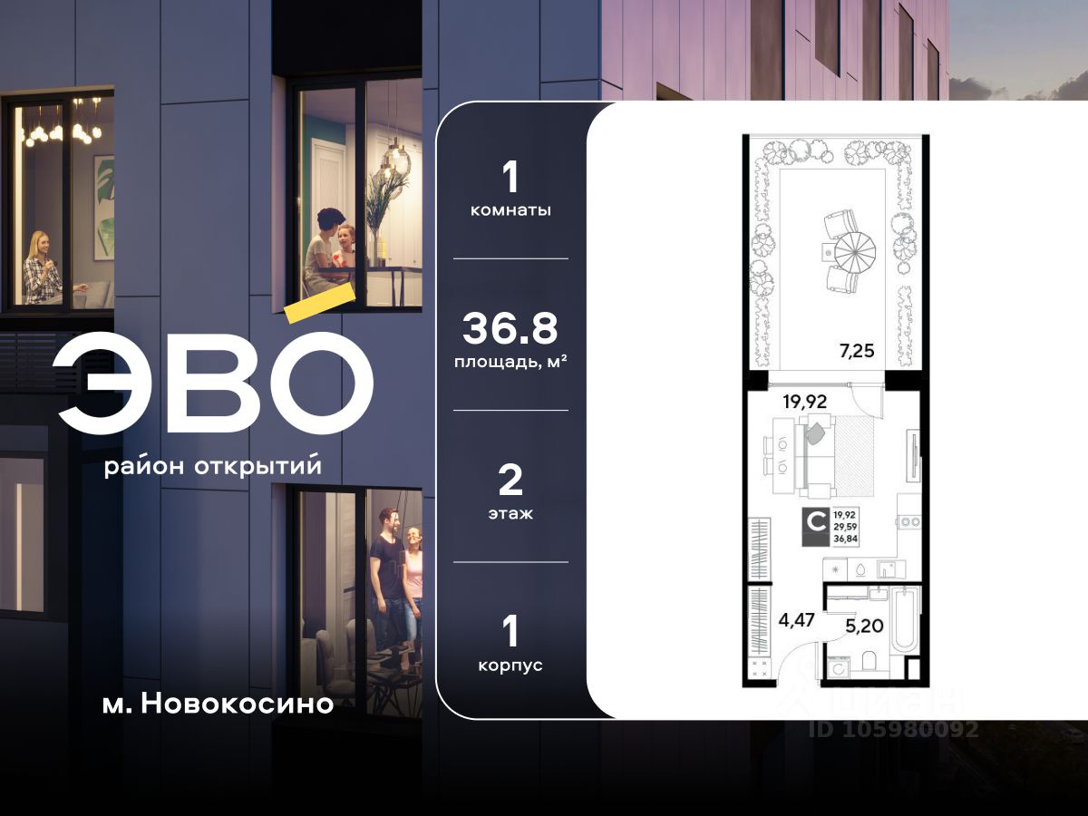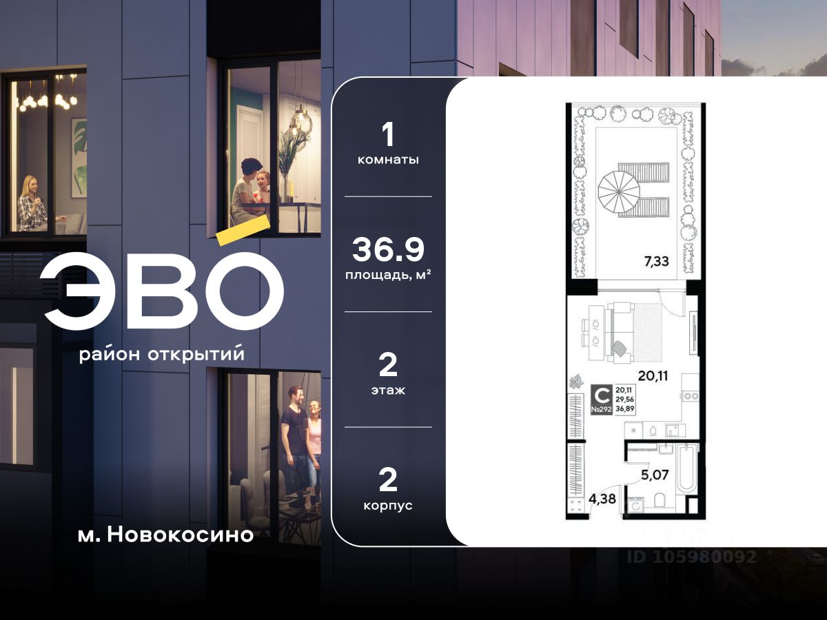 Продается студия 36.89 кв.м. в жилом комплексе ЭВО на 2 этаже по адресу: Московская область, г. Реутов, ул. Комсомольская. Скидка 10% при полной оплате!* ЭВО - проект комфорт-класса от девелопера Dogma. Каждый житель сможет открыть для себя максимум возможностей. Совершенствоваться во всех направлениях: физическом, эмоциональном и материальном. В ЭВО можно открыть для себя новые виды спорта, найти единомышленников по хобби, партнеров по бизнесу, развивать в детях новые грани, наслаждаться природой и лаконичной архитектурой. Более 6 га благоустройства в первой очереди! - Зеленый двор без машин, кленовая аллея для прогулок. - Нейродинамические площадки для детей разных возрастов. - Зона уличных тренажеров, столы для пинг-понга, места для занятия йогой. велодорожки и дорожки для скандинавской ходьбы. - Детский сад на 180 мест и школа на 750 мест. - Зона книгообмена - Лобби с зоной ожидания, колясочной и лапомойкой. - Магазины и кафе на первых этажах. БЕЗОПАСНОСТЬ - Закрытая территория. - Круглосуточное видеонаблюдение. - Контроль доступа. РАСПОЛОЖЕНИЕ Пешком - 7 минут до станции Реутов. - 20 минут до метро Новокосино. На машине - 4 минуты до МКАД. - 6 минут до шоссе Энтузиастов. - 9 минут до Носовихинское шоссе. - 13 минут до МСД (Московский скоростной диаметр). СОЦИАЛЬНАЯ ИНФРАСТРУКТУРА В первой очереди предусмотрено строительство детского сада на 180 мест и школы на 750 учащихся. В 10 минутах ходьбы от ЭВО находится детский технопарк ''Изобретариум'', в котором более 60 научных секции: от IT до промышленного дизайна. Для творческих ребят рядом есть художественная и музыкальные школы, хоровая студия. ОКРУЖЕНИЕ - Реутовский центральный парк, Александровский сквер, Фабричный пруд. - ТЦ ''Экватор'', ТК ''Шоколад''. - Спортивный комплекс ''Старт'', Ледовый комплекс ''Реутов Арена''. - Музей-усадьба ''Кусково''. *Подробности уточняйте по телефону.