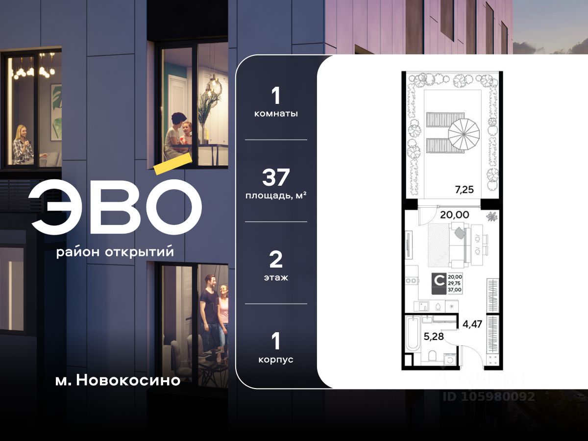 Продается студия 37.00 кв.м. в жилом комплексе ЭВО на 2 этаже по адресу: Московская область, г. Реутов, ул. Комсомольская. Скидка 10% при полной оплате!* ЭВО - проект комфорт-класса от девелопера Dogma. Каждый житель сможет открыть для себя максимум возможностей. Совершенствоваться во всех направлениях: физическом, эмоциональном и материальном. В ЭВО можно открыть для себя новые виды спорта, найти единомышленников по хобби, партнеров по бизнесу, развивать в детях новые грани, наслаждаться природой и лаконичной архитектурой. Более 6 га благоустройства в первой очереди! - Зеленый двор без машин, кленовая аллея для прогулок. - Нейродинамические площадки для детей разных возрастов. - Зона уличных тренажеров, столы для пинг-понга, места для занятия йогой. велодорожки и дорожки для скандинавской ходьбы. - Детский сад на 180 мест и школа на 750 мест. - Зона книгообмена - Лобби с зоной ожидания, колясочной и лапомойкой. - Магазины и кафе на первых этажах. БЕЗОПАСНОСТЬ - Закрытая территория. - Круглосуточное видеонаблюдение. - Контроль доступа. РАСПОЛОЖЕНИЕ Пешком - 7 минут до станции Реутов. - 20 минут до метро Новокосино. На машине - 4 минуты до МКАД. - 6 минут до шоссе Энтузиастов. - 9 минут до Носовихинское шоссе. - 13 минут до МСД (Московский скоростной диаметр). СОЦИАЛЬНАЯ ИНФРАСТРУКТУРА В первой очереди предусмотрено строительство детского сада на 180 мест и школы на 750 учащихся. В 10 минутах ходьбы от ЭВО находится детский технопарк ''Изобретариум'', в котором более 60 научных секции: от IT до промышленного дизайна. Для творческих ребят рядом есть художественная и музыкальные школы, хоровая студия. ОКРУЖЕНИЕ - Реутовский центральный парк, Александровский сквер, Фабричный пруд. - ТЦ ''Экватор'', ТК ''Шоколад''. - Спортивный комплекс ''Старт'', Ледовый комплекс ''Реутов Арена''. - Музей-усадьба ''Кусково''. *Подробности уточняйте по телефону.