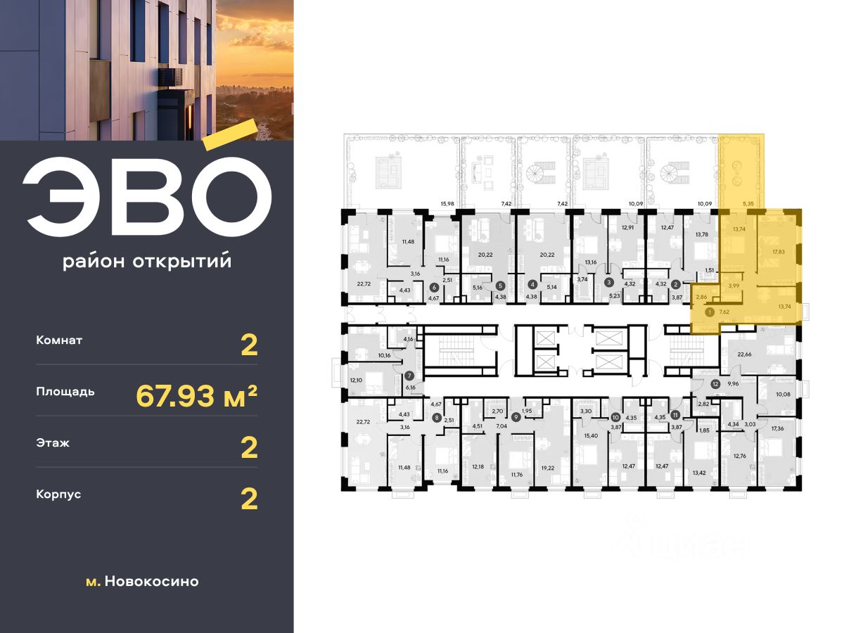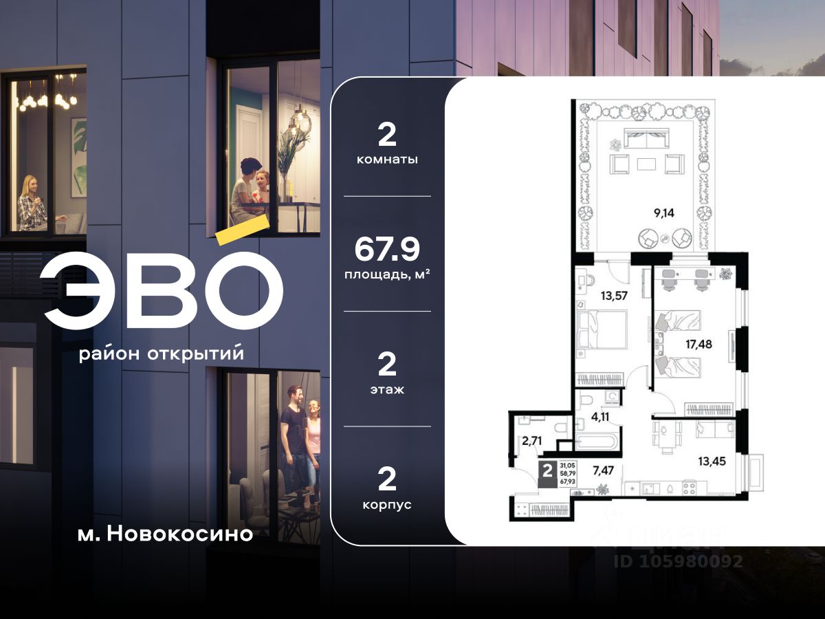 Продается двухкомнатная квартира 67.93 кв.м. в жилом комплексе ЭВО на 2 этаже по адресу: Московская область, г. Реутов, ул. Комсомольская. Скидка 10% при полной оплате!* ЭВО - проект комфорт-класса от девелопера Dogma. Каждый житель сможет открыть для себя максимум возможностей. Совершенствоваться во всех направлениях: физическом, эмоциональном и материальном. В ЭВО можно открыть для себя новые виды спорта, найти единомышленников по хобби, партнеров по бизнесу, развивать в детях новые грани, наслаждаться природой и лаконичной архитектурой. Более 6 га благоустройства в первой очереди! - Зеленый двор без машин, кленовая аллея для прогулок. - Нейродинамические площадки для детей разных возрастов. - Зона уличных тренажеров, столы для пинг-понга, места для занятия йогой. велодорожки и дорожки для скандинавской ходьбы. - Детский сад на 180 мест и школа на 750 мест. - Зона книгообмена - Лобби с зоной ожидания, колясочной и лапомойкой. - Магазины и кафе на первых этажах. БЕЗОПАСНОСТЬ - Закрытая территория. - Круглосуточное видеонаблюдение. - Контроль доступа. РАСПОЛОЖЕНИЕ Пешком - 7 минут до станции Реутов. - 20 минут до метро Новокосино. На машине - 4 минуты до МКАД. - 6 минут до шоссе Энтузиастов. - 9 минут до Носовихинское шоссе. - 13 минут до МСД (Московский скоростной диаметр). СОЦИАЛЬНАЯ ИНФРАСТРУКТУРА В первой очереди предусмотрено строительство детского сада на 180 мест и школы на 750 учащихся. В 10 минутах ходьбы от ЭВО находится детский технопарк ''Изобретариум'', в котором более 60 научных секции: от IT до промышленного дизайна. Для творческих ребят рядом есть художественная и музыкальные школы, хоровая студия. ОКРУЖЕНИЕ - Реутовский центральный парк, Александровский сквер, Фабричный пруд. - ТЦ ''Экватор'', ТК ''Шоколад''. - Спортивный комплекс ''Старт'', Ледовый комплекс ''Реутов Арена''. - Музей-усадьба ''Кусково''. *Подробности уточняйте по телефону.