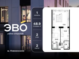 Продается однокомнатная квартира 48.92 кв.м. в жилом комплексе ЭВО на 2 этаже по адресу: Московская область, г. Реутов, ул. Комсомольская. Скидка 10% при полной оплате!*ЭВО - проект комфорт-класса от девелопера Dogma. Каждый житель сможет открыть для себя максимум возможностей. Совершенствоваться во всех направлениях: физическом, эмоциональном и материальном. В ЭВО можно открыть для себя новые виды спорта, найти единомышленников по хобби, партнеров по бизнесу, развивать в детях новые грани, наслаждаться природой и лаконичной архитектурой.Более 6 га благоустройства в первой очереди!- Зеленый двор без машин, кленовая аллея для прогулок.- Нейродинамические площадки для детей разных возрастов.- Зона уличных тренажеров, столы для пинг-понга, места для занятия йогой. велодорожки и дорожки для скандинавской ходьбы.- Детский сад на 180 мест и школа на 750 мест.- Зона книгообмена- Лобби с зоной ожидания, колясочной и лапомойкой.- Магазины и кафе на первых этажах.БЕЗОПАСНОСТЬ- Закрытая территория.- Круглосуточное видеонаблюдение.- Контроль доступа.РАСПОЛОЖЕНИЕПешком- 7 минут до станции Реутов.- 20 минут до метро Новокосино.На машине- 4 минуты до МКАД.- 6 минут до шоссе Энтузиастов.- 9 минут до Носовихинское шоссе.- 13 минут до МСД (Московский скоростной диаметр).СОЦИАЛЬНАЯ ИНФРАСТРУКТУРАВ первой очереди предусмотрено строительство детского сада на 180 мест и школы на 750 учащихся. В 10 минутах ходьбы от ЭВО находится детский технопарк ''Изобретариум'', в котором более 60 научных секции: от IT до промышленного дизайна. Для творческих ребят рядом есть художественная и музыкальные школы, хоровая студия.ОКРУЖЕНИЕ- Реутовский центральный парк, Александровский сквер, Фабричный пруд.- ТЦ ''Экватор'', ТК ''Шоколад''.- Спортивный комплекс ''Старт'', Ледовый комплекс ''Реутов Арена''.- Музей-усадьба ''Кусково''.*Подробности уточняйте по телефону.