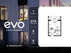 Продается студия 27.94 кв.м. в жилом комплексе EVO на 13 этаже по адресу: Московская область, г. Реутов, ул. Комсомольская. Скидка 10% при полной оплате!*EVO - проект комфорт-класса от девелопера Dogma. Каждый житель сможет открыть для себя максимум возможностей. Совершенствоваться во всех направлениях: физическом, эмоциональном и материальном. В EVO можно открыть для себя новые виды спорта, найти единомышленников по хобби, партнеров по бизнесу, развивать в детях новые грани, наслаждаться природой и лаконичной архитектурой.Более 6 га благоустройства в первой очереди!- Зеленый двор без машин, кленовая аллея для прогулок.- Нейродинамические площадки для детей разных возрастов.- Workout зона, столы для пинг-понга, места для занятия йогой. велодорожки и дорожки для скандинавской ходьбы.- Детский сад на 180 мест и школа на 750 мест.- Кроссбукинг.- Лобби с зоной ожидания, колясочной и лапомойкой.- Магазины и кафе на первых этажах.БЕЗОПАСНОСТЬ- Закрытая территория.- Круглосуточное видеонаблюдение.- Контроль доступа.РАСПОЛОЖЕНИЕПешком- 7 минут до станции Реутов.- 20 минут до метро Новокосино.На машине- 4 минуты до МКАД.- 6 минут до шоссе Энтузиастов.- 9 минут до Носовихинское шоссе.- 13 минут до МСД (Московский скоростной диаметр).СОЦИАЛЬНАЯ ИНФРАСТРУКТУРАВ первой очереди предусмотрено строительство детского сада на 180 мест и школы на 750 учащихся. В 10 минутах ходьбы от EVO находится детский технопарк ''Изобретариум'', в котором более 60 научных секции: от IT до промышленного дизайна. Для творческих ребят рядом есть художественная и музыкальные школы, хоровая студия.ОКРУЖЕНИЕ- Реутовский центральный парк, Александровский сквер, Фабричный пруд.- ТЦ ''Экватор'', ТК ''Шоколад''.- Спортивный комплекс ''Старт'', Ледовый комплекс ''Реутов Арена''.- Музей-усадьба ''Кусково''.*Подробности уточняйте по телефону.