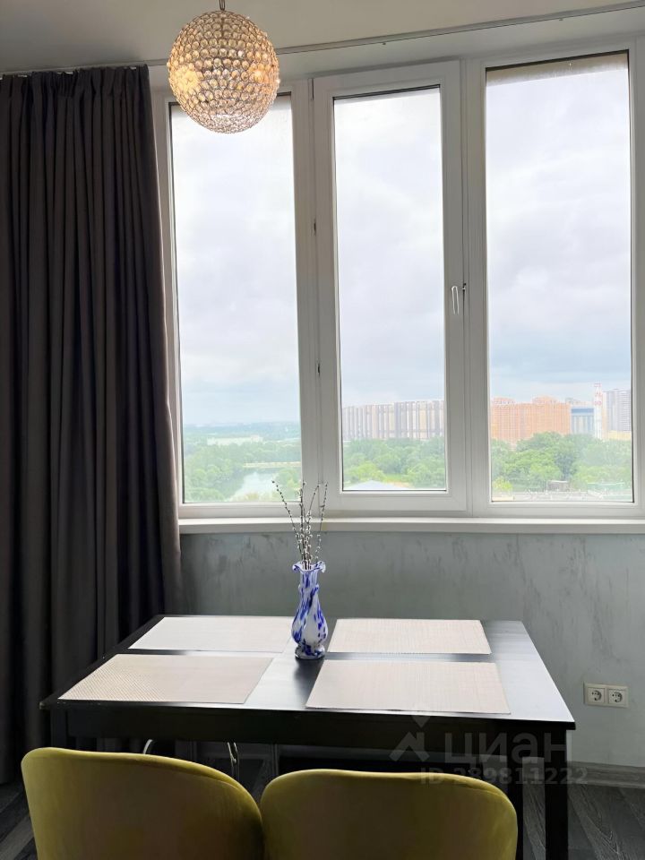 Кухня объединена с теплой застекленной лоджией, на которой имеется выделенная обеденная зона. Из окна открывается красивый вид на городской пруд.