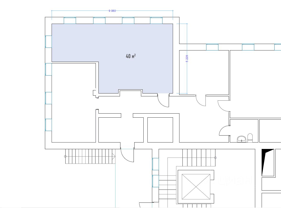 Зал 40м2, а также 5м2 места общего пользования (коридор, с/у).