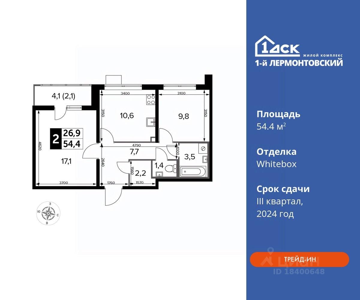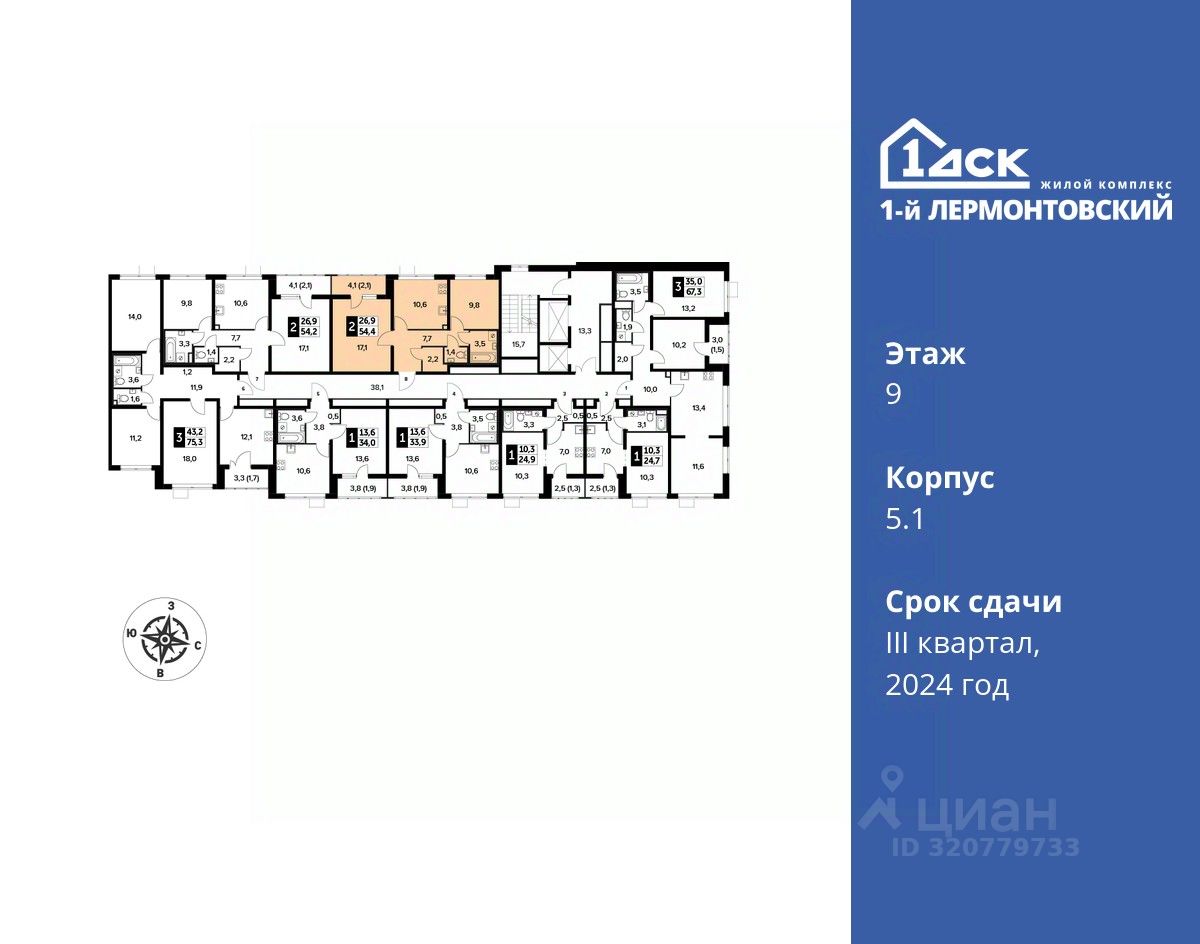 Максимальные скидки при 100% оплате. Корпус сдан! Прямая продажа от застройщика! Жилой Комплекс класса Комфорт плюс. Продаётся 2-к квартира номер 685 в сданном корпусе общей площадью 54.4 кв.м на 9-м этаже 25 этажного дома.