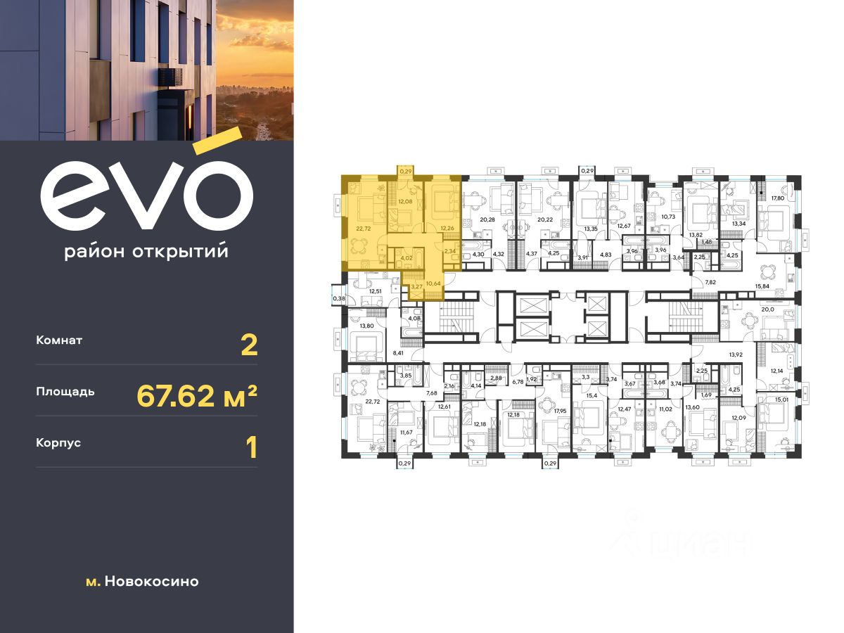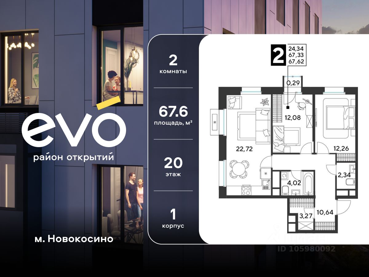 Продается двухкомнатная квартира 67.62 кв.м. в жилом комплексе EVO на 20 этаже по адресу: Московская область, г. Реутов, ул. Комсомольская. EVO - проект комфорт-класса от девелопера Dogma. Каждый житель сможет открыть для себя максимум возможностей. Совершенствоваться во всех направлениях: физическом, эмоциональном и материальном. В EVO можно открыть для себя новые виды спорта, найти единомышленников по хобби, партнеров по бизнесу, развивать в детях новые грани, наслаждаться природой и лаконичной архитектурой.
