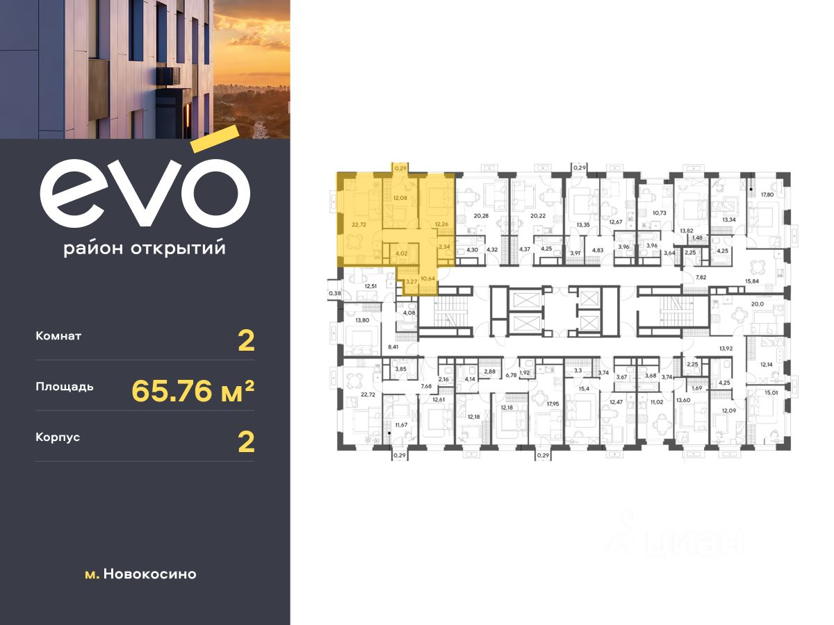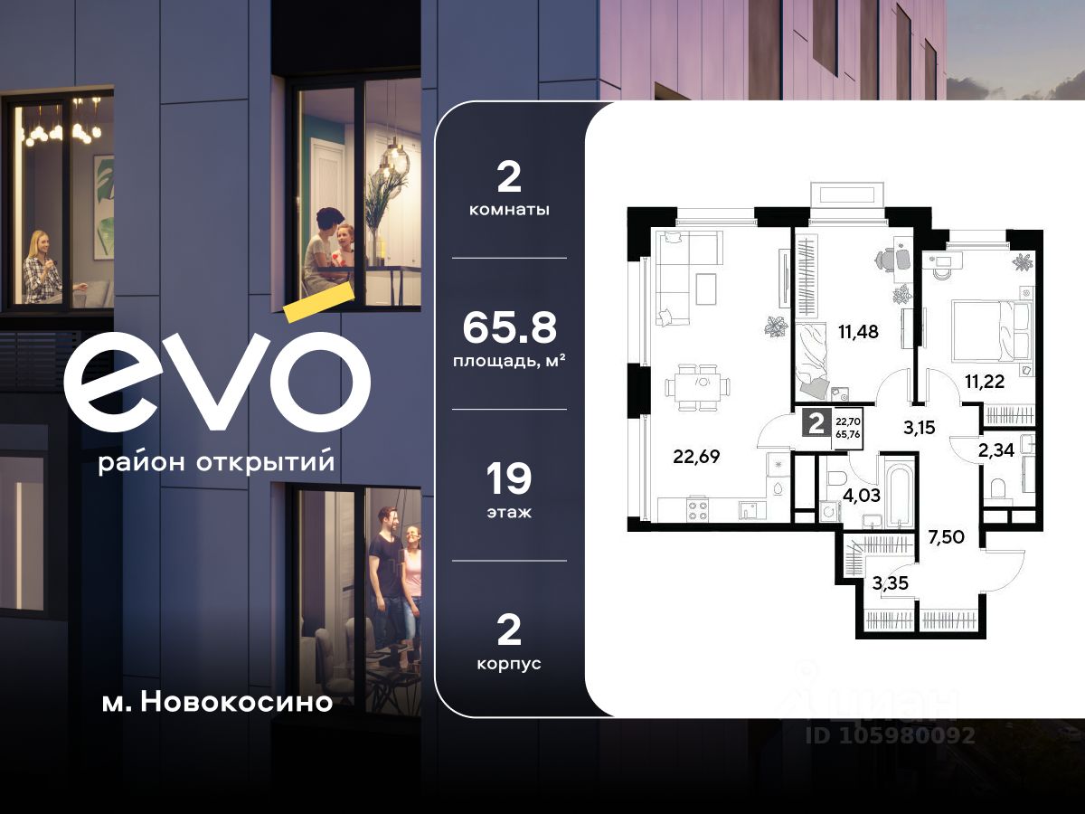 Продается двухкомнатная квартира 65.76 кв.м. в жилом комплексе EVO на 19 этаже по адресу: Московская область, г. Реутов, ул. Комсомольская. EVO - проект комфорт-класса от девелопера Dogma. Каждый житель сможет открыть для себя максимум возможностей. Совершенствоваться во всех направлениях: физическом, эмоциональном и материальном. В EVO можно открыть для себя новые виды спорта, найти единомышленников по хобби, партнеров по бизнесу, развивать в детях новые грани, наслаждаться природой и лаконичной архитектурой.