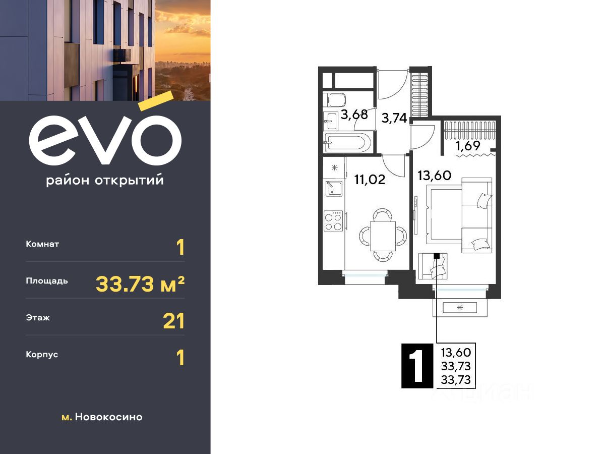 Продается однокомнатная квартира 33.73 кв.м. в жилом комплексе EVO на 21 этаже по адресу: Московская область, г. Реутов, ул. Комсомольская. EVO - проект комфорт-класса от девелопера Dogma. Каждый житель сможет открыть для себя максимум возможностей. Совершенствоваться во всех направлениях: физическом, эмоциональном и материальном. В EVO можно открыть для себя новые виды спорта, найти единомышленников по хобби, партнеров по бизнесу, развивать в детях новые грани, наслаждаться природой и лаконичной архитектурой.