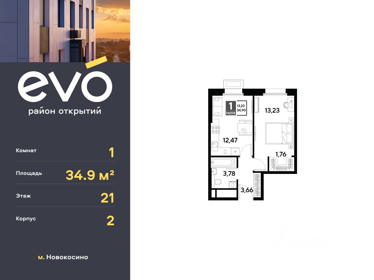 Продается однокомнатная квартира 34.90 кв.м. в жилом комплексе EVO на 21 этаже по адресу: Московская область, г. Реутов, ул. Комсомольская. EVO - проект комфорт-класса от девелопера Dogma. Каждый житель сможет открыть для себя максимум возможностей. Совершенствоваться во всех направлениях: физическом, эмоциональном и материальном. В EVO можно открыть для себя новые виды спорта, найти единомышленников по хобби, партнеров по бизнесу, развивать в детях новые грани, наслаждаться природой и лаконичной архитектурой.
