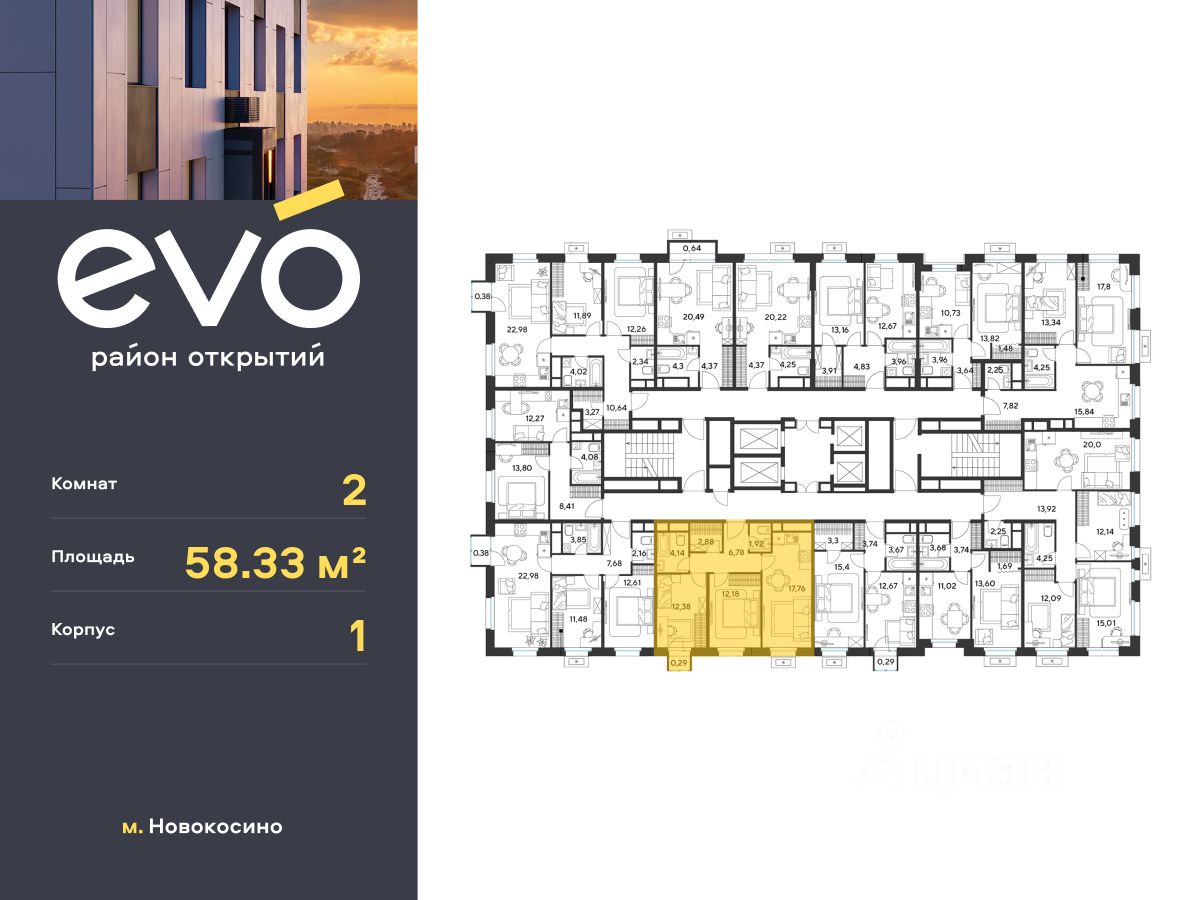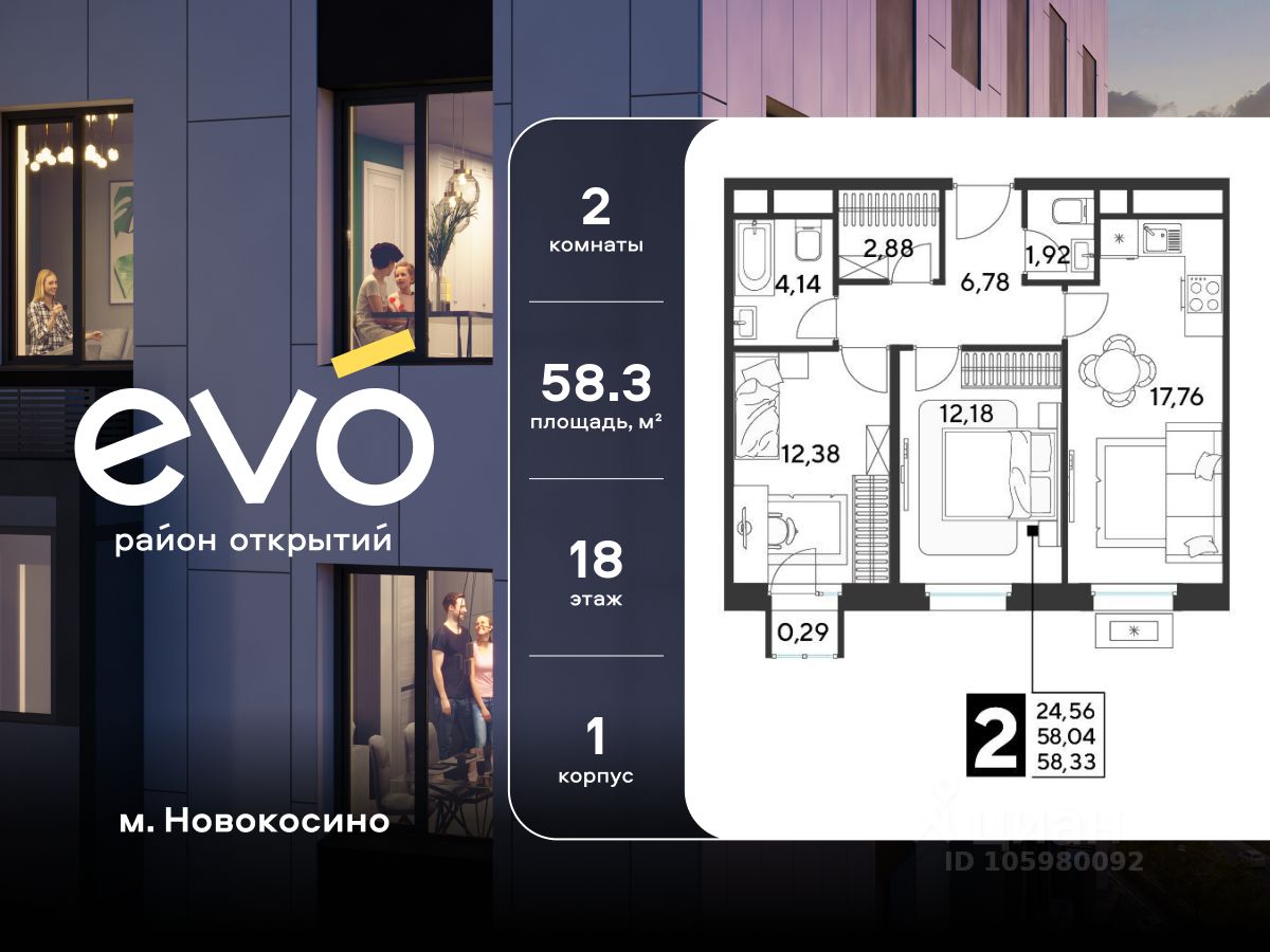Продается двухкомнатная квартира 58.33 кв.м. в жилом комплексе EVO на 18 этаже по адресу: Московская область, г. Реутов, ул. Комсомольская. EVO - проект комфорт-класса от девелопера Dogma. Каждый житель сможет открыть для себя максимум возможностей. Совершенствоваться во всех направлениях: физическом, эмоциональном и материальном. В EVO можно открыть для себя новые виды спорта, найти единомышленников по хобби, партнеров по бизнесу, развивать в детях новые грани, наслаждаться природой и лаконичной архитектурой.