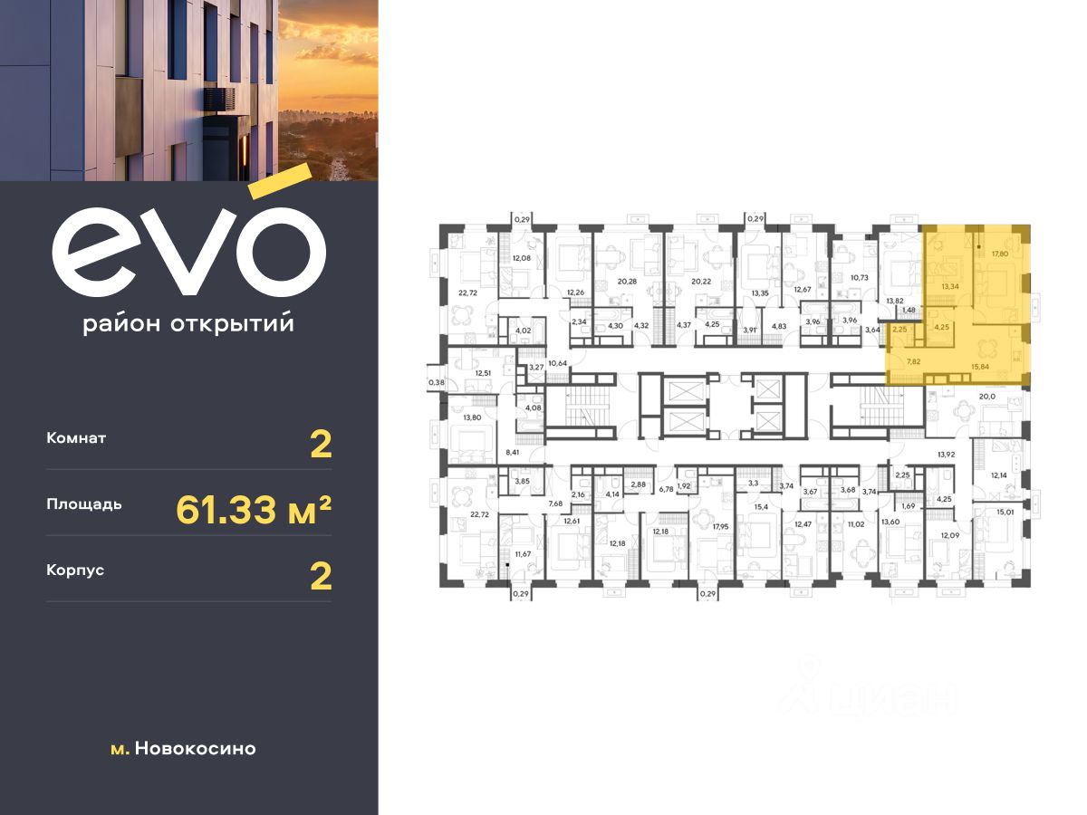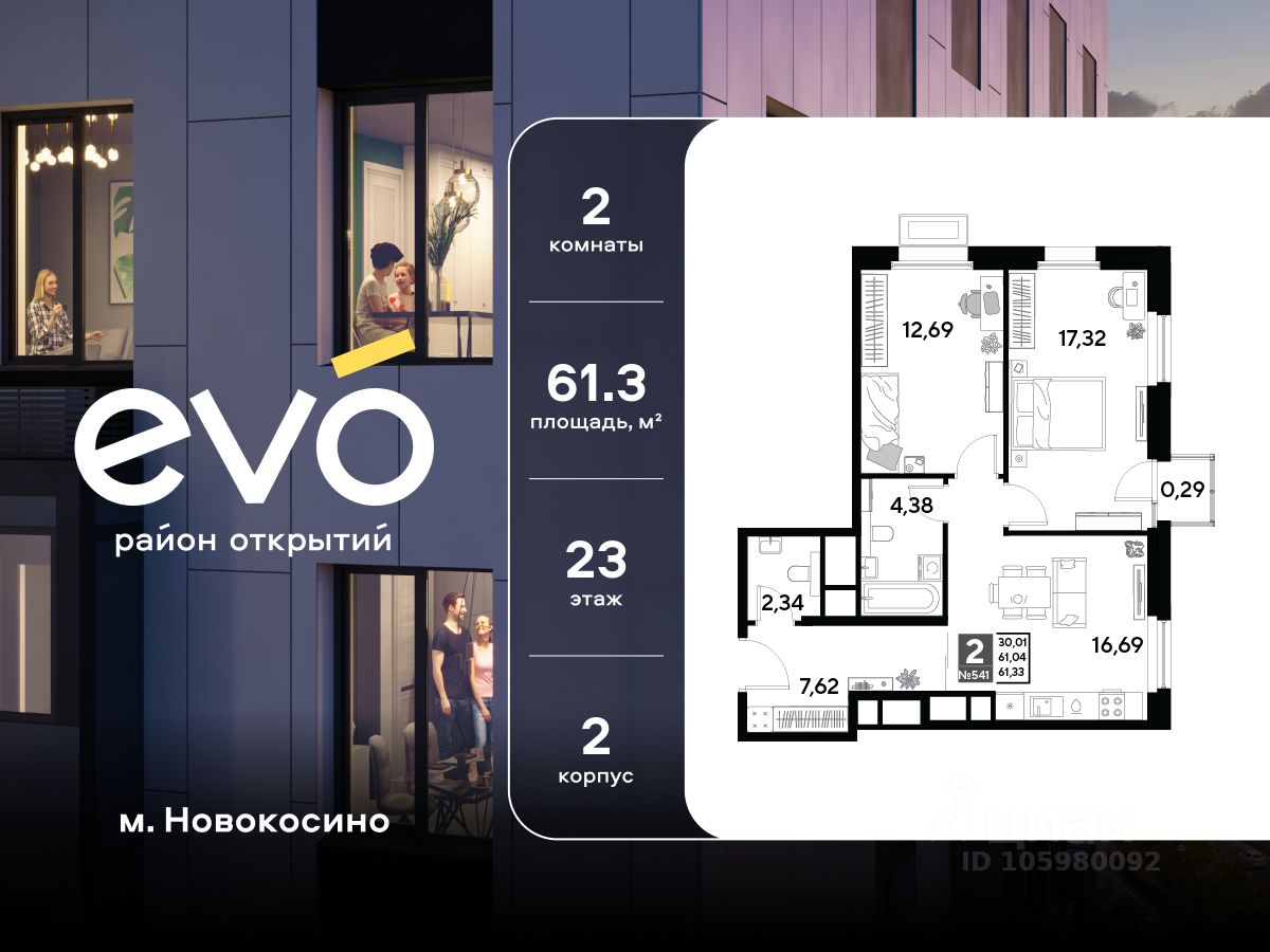 Продается двухкомнатная квартира 61.33 кв.м. в жилом комплексе EVO на 23 этаже по адресу: Московская область, г. Реутов, ул. Комсомольская. Скидка 10% на пул квартир!* EVO - проект комфорт-класса от девелопера Dogma. Каждый житель сможет открыть для себя максимум возможностей. Совершенствоваться во всех направлениях: физическом, эмоциональном и материальном. В EVO можно открыть для себя новые виды спорта, найти единомышленников по хобби, партнеров по бизнесу, развивать в детях новые грани, наслаждаться природой и лаконичной архитектурой.