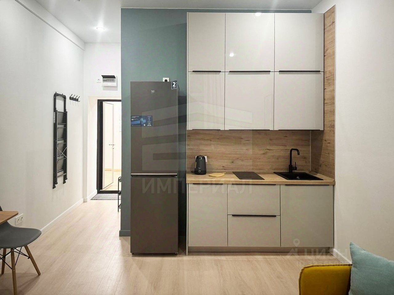 На стенах поклеены обои под покраску, на полу постелен ламинат с плинтусами и откосами. Есть вытяжная вентиляция в санузле и на кухне, выходы хв/гв, место под раковину на кухне. Кроме того, в помещениях уже есть выключатели освещения, розетки для бытовой техники и роутера, а также сделаны закладные для оптоволокна для интернета.