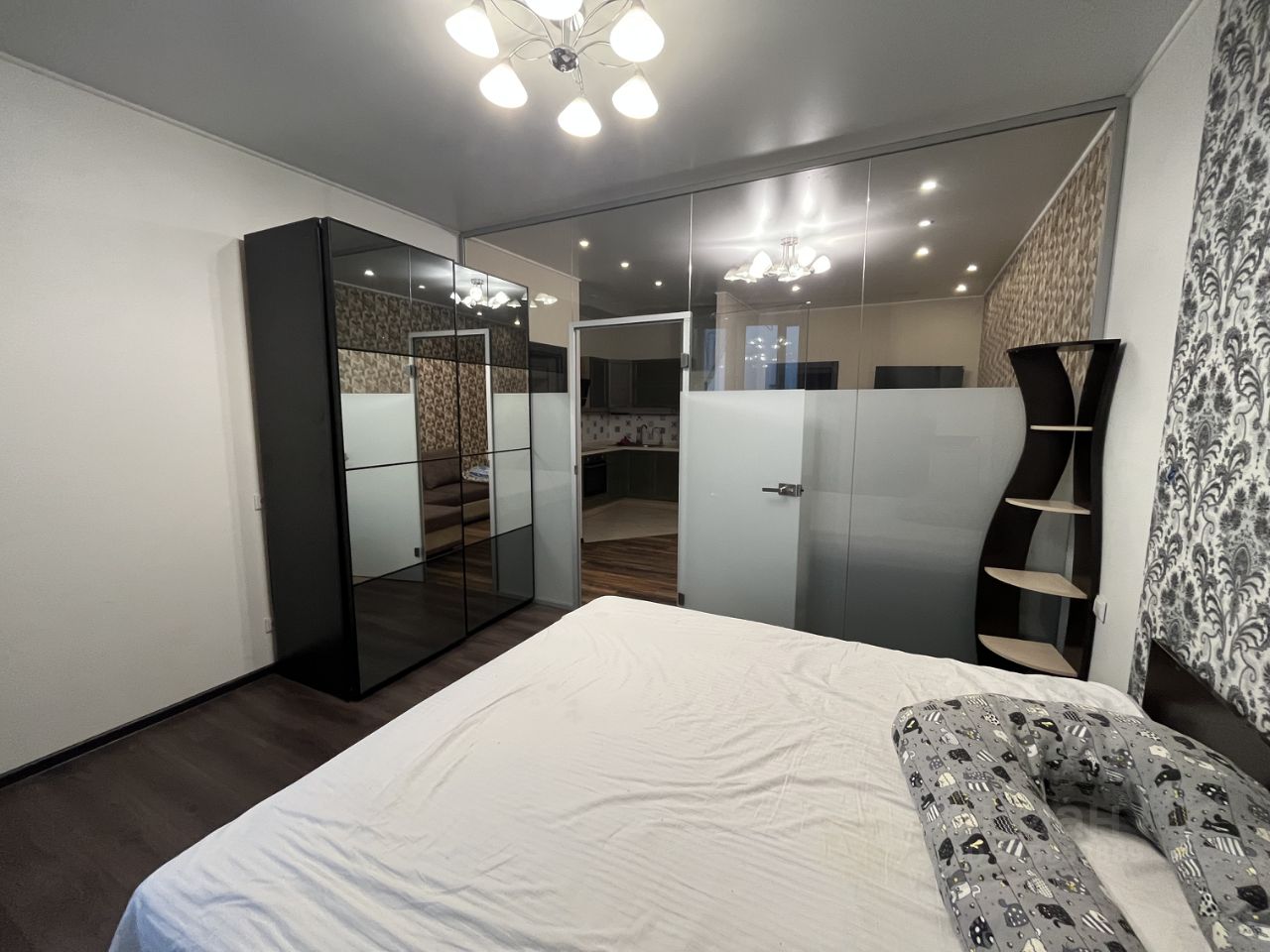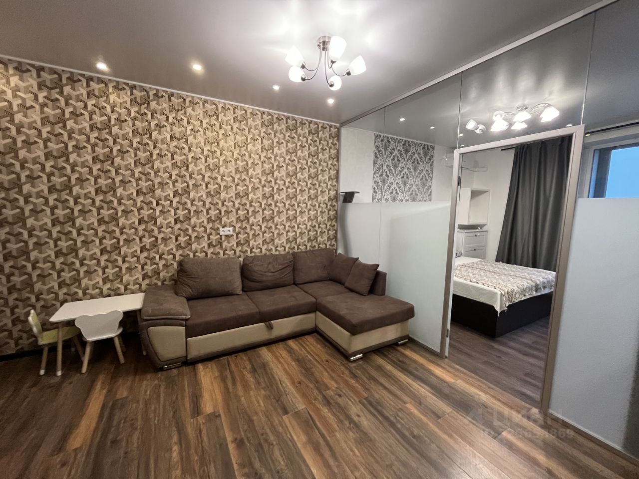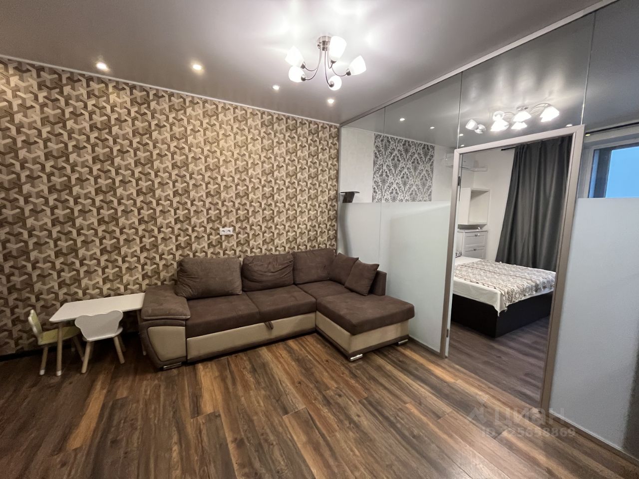 Планировка квартиры - кухня-гостиная из которой выход в спальню и в детскую комнату, совмещенный сан.узел с ванной, в прихожей при входе есть гардеробная, в квартире два окна.