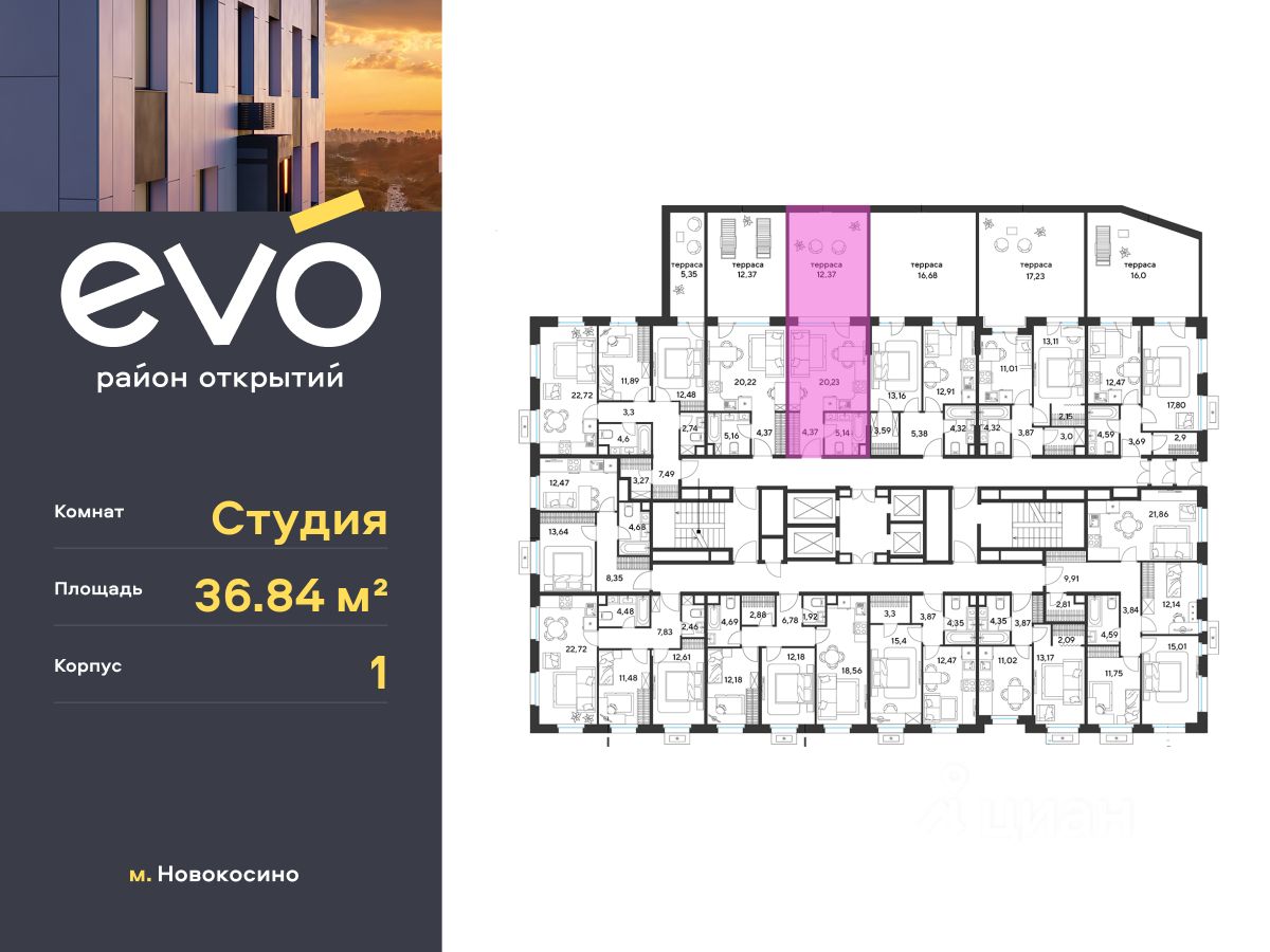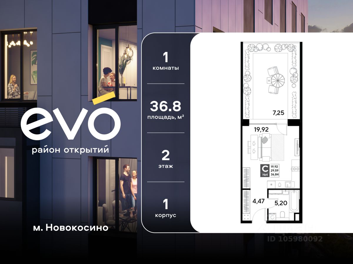 Продается студия 36.84 кв.м. в жилом комплексе ЭВО на 2 этаже по адресу: Московская область, г. Реутов, ул. Комсомольская. Скидка 10% при полной оплате!* ЭВО - проект комфорт-класса от девелопера Dogma. Каждый житель сможет открыть для себя максимум возможностей. Совершенствоваться во всех направлениях: физическом, эмоциональном и материальном. В ЭВО можно открыть для себя новые виды спорта, найти единомышленников по хобби, партнеров по бизнесу, развивать в детях новые грани, наслаждаться природой и лаконичной архитектурой.