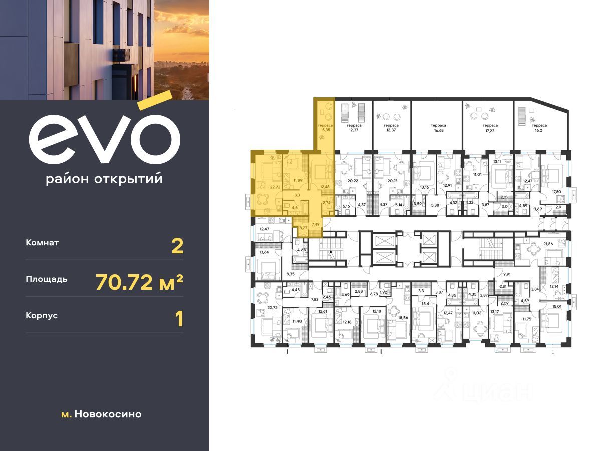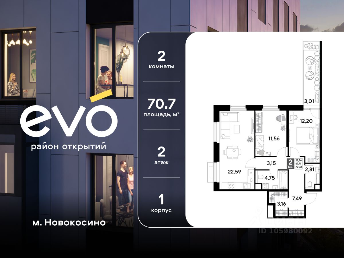 Продается двухкомнатная квартира 70.72 кв.м. в жилом комплексе ЭВО на 2 этаже по адресу: Московская область, г. Реутов, ул. Комсомольская. Скидка 15% на выделенный пул двухкомнатных и трёхкомнатных квартир с готовностью в 2026 году!* ЭВО - проект комфорт-класса от девелопера Dogma. Каждый житель сможет открыть для себя максимум возможностей. Совершенствоваться во всех направлениях: физическом, эмоциональном и материальном. В ЭВО можно открыть для себя новые виды спорта, найти единомышленников по хобби, партнеров по бизнесу, развивать в детях новые грани, наслаждаться природой и лаконичной архитектурой.