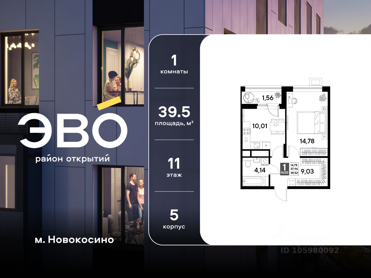 Продается однокомнатная квартира 39.52 кв.м. в жилом комплексе ЭВО на 11 этаже по адресу: Московская область, г. Реутов, ул. Комсомольская. Скидка 10% при полной оплате!* ЭВО - проект комфорт-класса от девелопера Dogma. Каждый житель сможет открыть для себя максимум возможностей. Совершенствоваться во всех направлениях: физическом, эмоциональном и материальном. В ЭВО можно открыть для себя новые виды спорта, найти единомышленников по хобби, партнеров по бизнесу, развивать в детях новые грани, наслаждаться природой и лаконичной архитектурой.